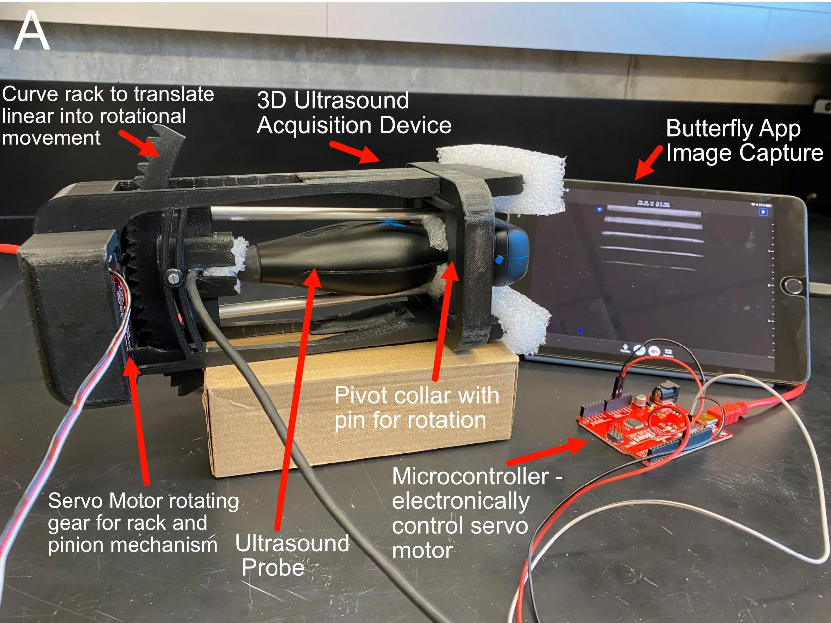 This is a handheld, battery operated, ultrasound rotation point of care (POC) device that standardizes the way ophthalmic ultrasound images are taken. This device mechanically rotates a handheld Butterfly iQ ultrasound probe across the human probe to acquire images of the globe. Videos and images of the globe are converted into image slices that are then stitched together in a computer to render a 3D image of the anatomical structures of the eye, which can be used for evaluation and diagnosis. This device can be used at the bedside, in the OR, or in any low-resource setting.