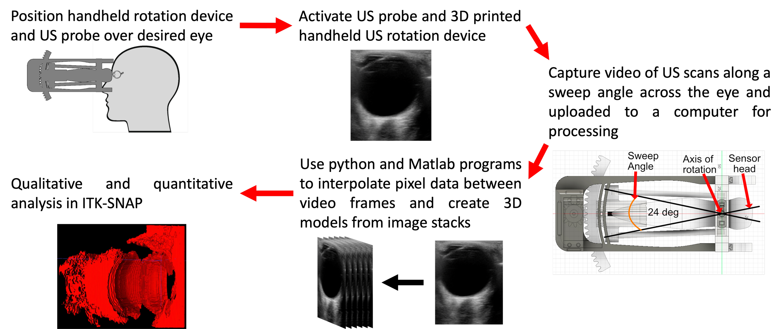 These are the steps of how the device works, rotating a US probe across a human eye and then converting captured 2D image data into a 3D model.